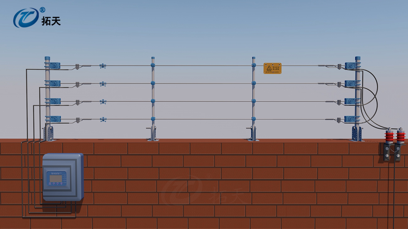 3、現前端圍欄上每根線每個點(diǎn)都有3000V-5500V高壓脈沖(chōng)電,讓入侵者無機可乘