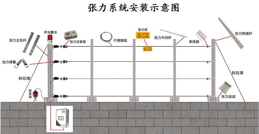 現在來說下張力電子圍欄 ,前面也說瞭(le)張力圍欄和脈沖圍欄最大的區别就是張力圍欄不具備有高壓脈沖電擊功能,報警和阻擋同樣具備瞭(le)。張力圍欄的報警方式是當前端的圍欄的拉力值發生瞭(le)改變就會産生報警信号。由於(yú)張力圍欄是一種物理性的報警方式,所以張力圍欄的每個的防區控制長度就相對較短一般在40米以内爲一個防區。由於(yú)防區控制長度較短,在同周長的項目上整體的造價成本相比脈沖圍欄要高一些。