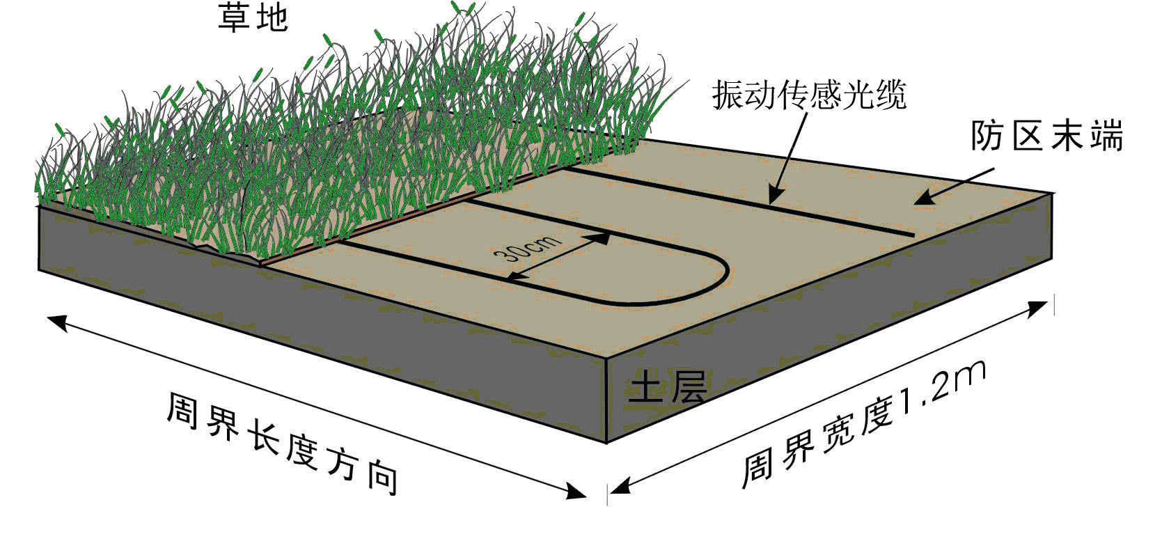 在沙土地下埋設振動傳感光纜時,也採用平行鋪設多道振動傳感光纜的鋪設方式,但由於沙土比較松軟 ,當入侵者進入該區域時,透過沙土層對振動傳感光纜施加壓力,振動傳感光纜可探測到微小的擠壓變形並産生信号,所以在沙土地埋設振動傳感光纜時 ,應減少平行振動傳感光纜的間距,而且埋設不可過深。通常採用的間隔爲20--25cm,埋設深度爲5--10cm,如圖。在進行施工時,首先在需要鋪設光纜的區域挖出一道寬1.2m,深10cm的凹槽,在凹槽的底部平鋪一層厚度爲3cm的粗沙,再将振動傳感光纜平行鋪設於粗沙表面,每隔50cm用鋼絲線卡子固定。光纜鋪設完成後,在其上面覆蓋一層厚度爲5cm的粗沙,最後在其表面均勻地覆蓋一層1--2cm的地表介質(細沙或松散幹燥的泥土)。